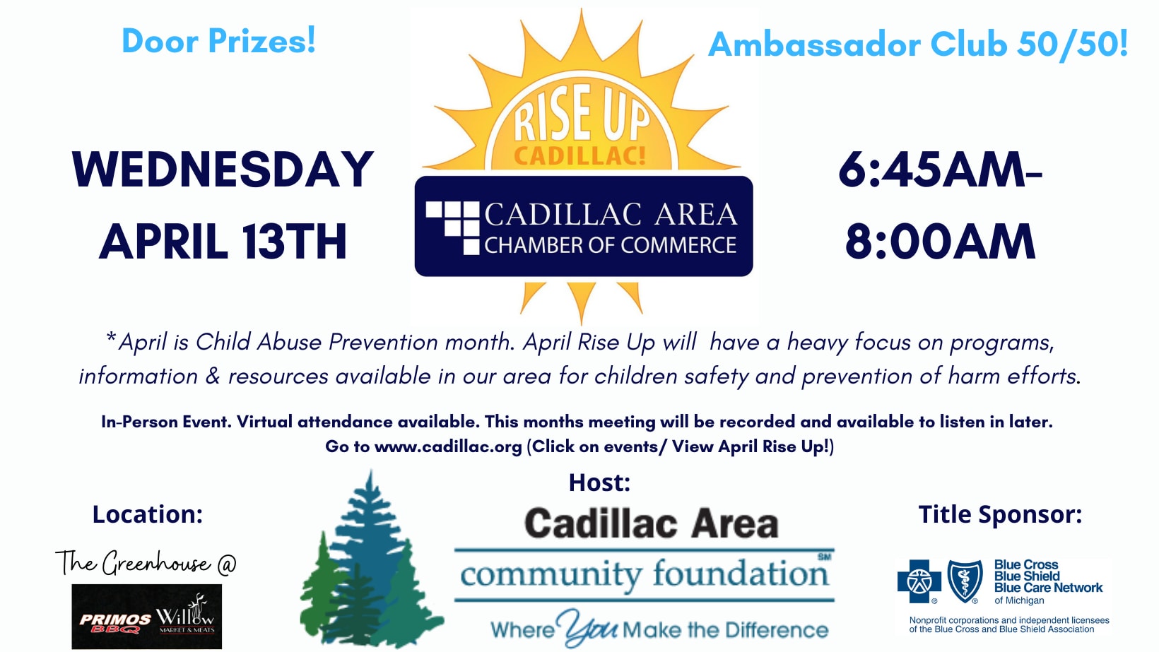 Join the Chamber for Rise Up Cadillac, April 13th at 6:45 AM! Hosted by Cadillac Area Community Foundation and Sponsored by: Blue Cross Blue Shield. Located at Willow Mercantile/Primos Greenhouse. This Monthly Morning networking program is designed to keep members and community informed about the greater Cadillac Area. As April is Child Abuse Prevention month, this meeting will have a heavy focus on information, and resources available in our area and prevention of harm efforts. In Person Event- Virtual attendance available (Link Below) Join Zoom Meeting https://us06web.zoom.us/j/84751620079?pwd=YTd1RnRTaExwMmFOeVNha0NFSENNZz09 Meeting ID: 847 5162 0079 Passcode: 796387 One tap mobile +16465588656,,84751620079#,,,,*796387# US (New York) +13017158592,,84751620079#,,,,*796387# US (Washington DC) Dial by your location +1 646 558 8656 US (New York) +1 301 715 8592 US (Washington DC) +1 312 626 6799 US (Chicago) +1 720 707 2699 US (Denver) +1 253 215 8782 US (Tacoma) +1 346 248 7799 US (Houston) Meeting ID: 847 5162 0079 Passcode: 796387 Find your local number: https://us06web.zoom.us/u/kQEdhlXAiImages